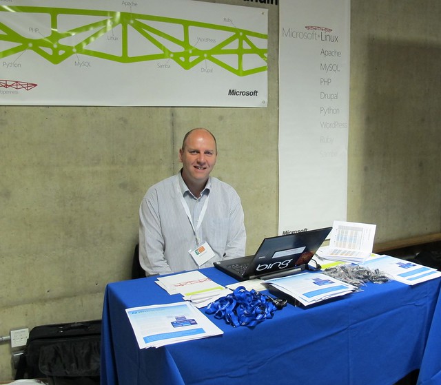 During the break, right before the next talk we saw this vendor with the surprising words "Microsoft+Linux", we were in shock! π